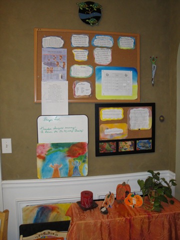 Bulletin boards are not especially Waldorf-y but I have to have one.  It has all our prayers for the day, our white little prayer board, more Crucian glass.  The silks are covering a bookcase.  There are painting boards and lap-sized chalkboards slid behind the bookcase.  Foreign language materials are in a little painted wooden holder next to the bookcase.  Then there is a doorway to the kitchen and this little bookcase and Nature Table in the corner: