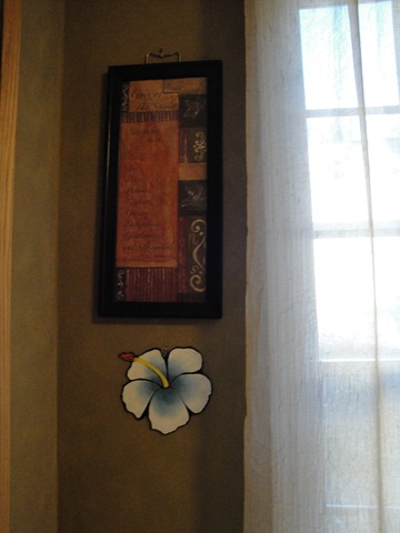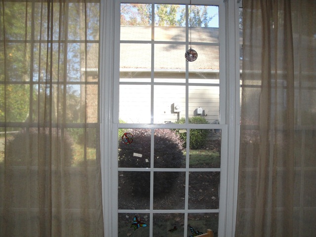 Just a small view of outside with sheers and a suncatcher.    Next to the window, also on the South wall: