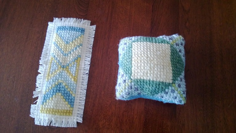 Fourth grade is a time of cross stitching.  The designs for these projects were done by my fourth grader, including choosing the colors and such.  The pin cushion has leather backing so the pins will not stick through!